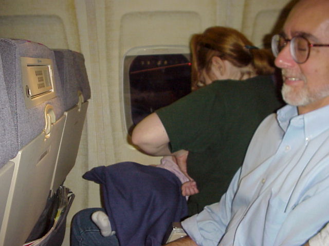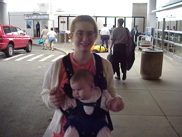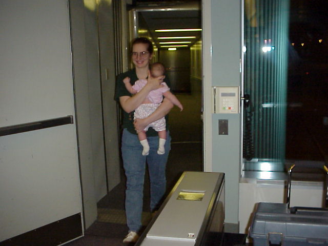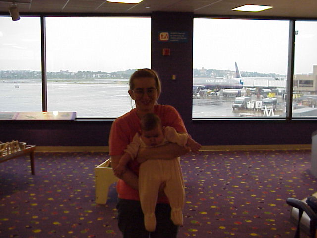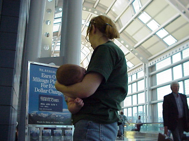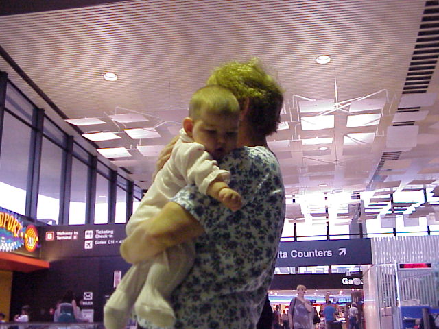 I bet Eileen wishes someone would carry her so she could sleep. Our plane was canceled and we are now waiting for a standby flight.